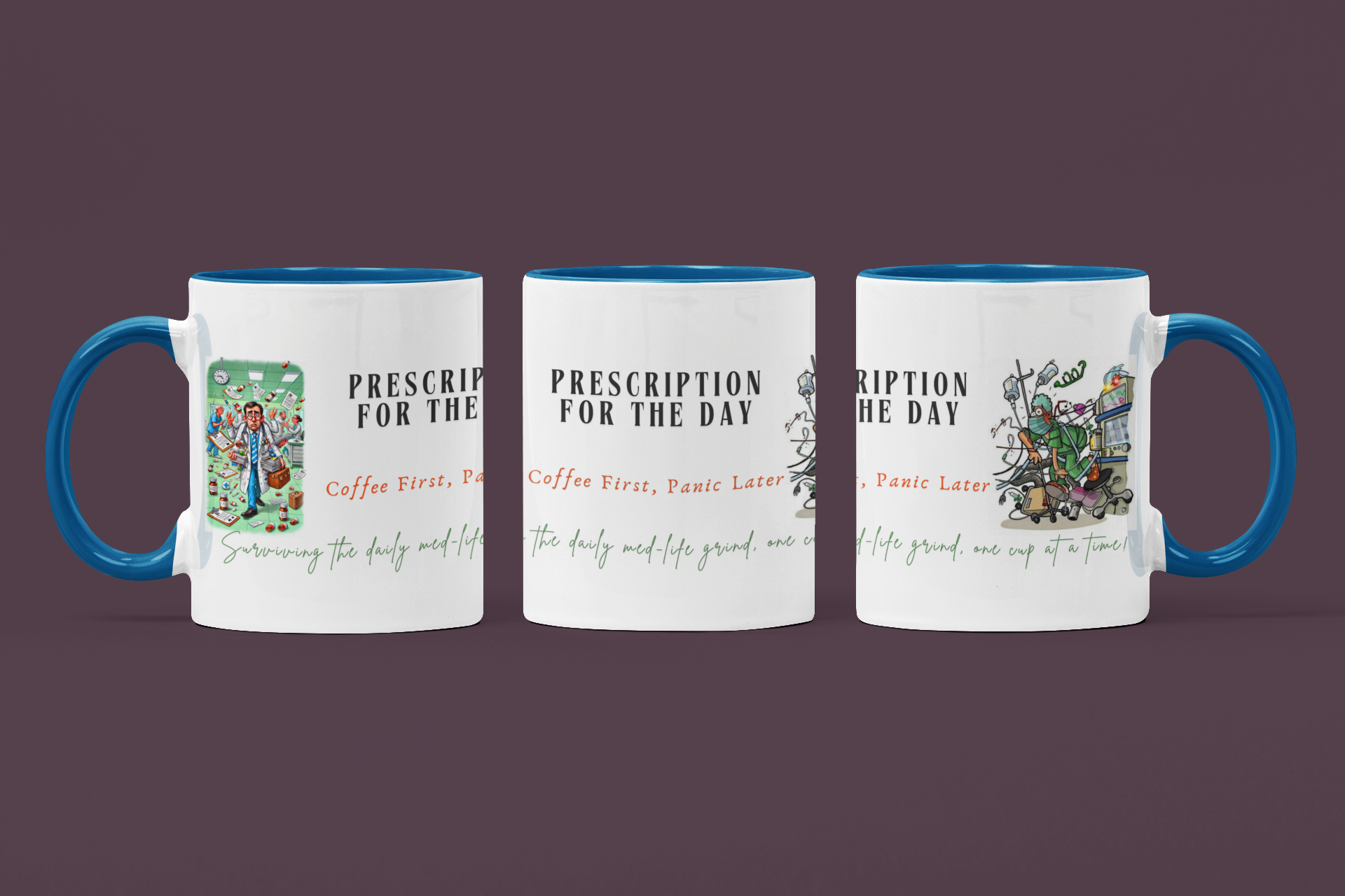 Kickstart your daily routine with the "Prescription for the Day" ceramic mug, perfect for doctors and medical professionals. This stylish Sky Blue mug combines a playful design with a motivational twist, featuring the phrase "Coffee First, Panic Later" and the tagline "Surviving the daily med-life grind, one cup at a time." It's an ideal addition to any doctor's work desk, ensuring that your morning coffee comes with a side of humor.